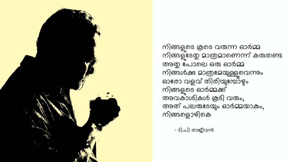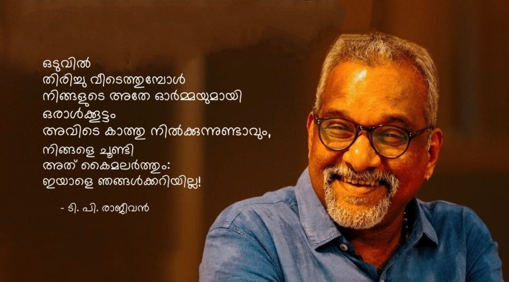 ടിപി രാജീവൻ്റെ കവിതകളിൽ സങ്കീര്‍ണ്ണതകളെല്ലാം മാറിനിൽക്കുന്നു. കവിതയിലും നോവലിലും ലേഖനങ്ങളിലും കോളങ്ങളിലും സഞ്ചാര സാഹിത്യത്തിലും വിവര്‍ത്തനത്തിലുമെല്ലാം രാജീവന്‍ പിന്തുടര്‍ന്ന വഴി. വായനക്കാരനെ ക്ലേശിപ്പിക്കുന്ന എഴുത്തുകാരനല്ല രാജീവന്‍. കൂടുതല്‍ സുതാര്യതയിലേക്ക് ഒരാളെ നയിക്കാന്‍ പ്രാപ്തിയുള്ള സര്‍ഗ ഭാവനയുടെ ഉടമയായിരുന്നു. അടിത്തട്ട് വരെ തെളിഞ്ഞു കാണുന്ന ‘ലഗൂണ്‍’ പാതകളെയാണ് ഈ എഴുത്തുകാരന്‍ തുടക്കം മുതലേ ആവിഷ്‌ക്കരിച്ചു പോന്നിട്ടുള്ളത് – വി. മുസഫർ അഹമ്മദ് എഴുതുന്നു.