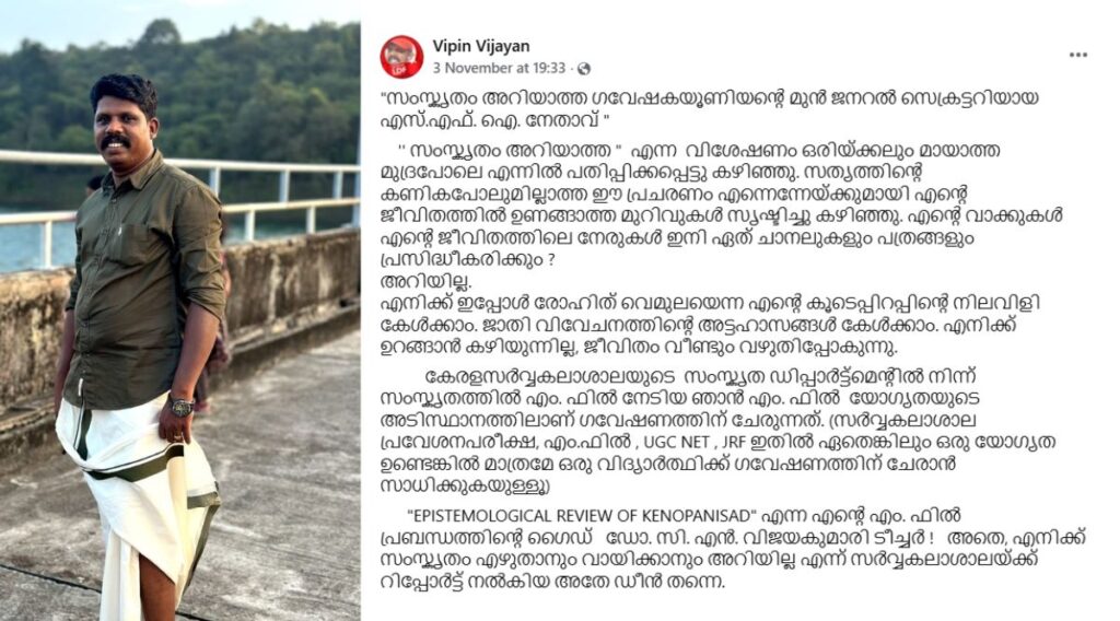 ഇനി വിപിൻ വിജയൻറെ കേസിലേക്ക് വരാം. അങ്ങേയറ്റം വ്യക്തിഹത്യയാണ് അദ്ദേഹത്തിന് നേരിടേണ്ടി വന്നത് എന്ന കാര്യത്തിൽ തർക്കമില്ല. സംസ്കൃതം, തമിഴ്, അറബി തുടങ്ങിയ ന്യൂനപക്ഷ ഭാഷകളിൽ ഗവേഷണം ചെയ്യുന്ന വിദ്യാർത്ഥികൾ ഇത്തരത്തിൽ വേട്ടയാടപ്പെടുന്നത് ഇതാദ്യമായല്ല. തങ്ങളുടെ നിർദേശമുണ്ടെങ്കിൽ മാത്രമേ ഗവേഷകന് സ്വന്തം റിസർച്ച് മുന്നോട്ട് കൊണ്ടുപോകാൻ കഴിയൂ എന്ന മട്ടിൽ, മേൽപ്പറഞ്ഞ പണ്ഡിതന്മാർക്ക് സർവാധികാരവും നൽകുന്ന വിധത്തിലാണ് ഈ സിസ്റ്റം രൂപകൽപ്പന ചെയ്യപ്പെട്ടിരിക്കുന്നത് എന്നതു തന്നെ കാരണം.